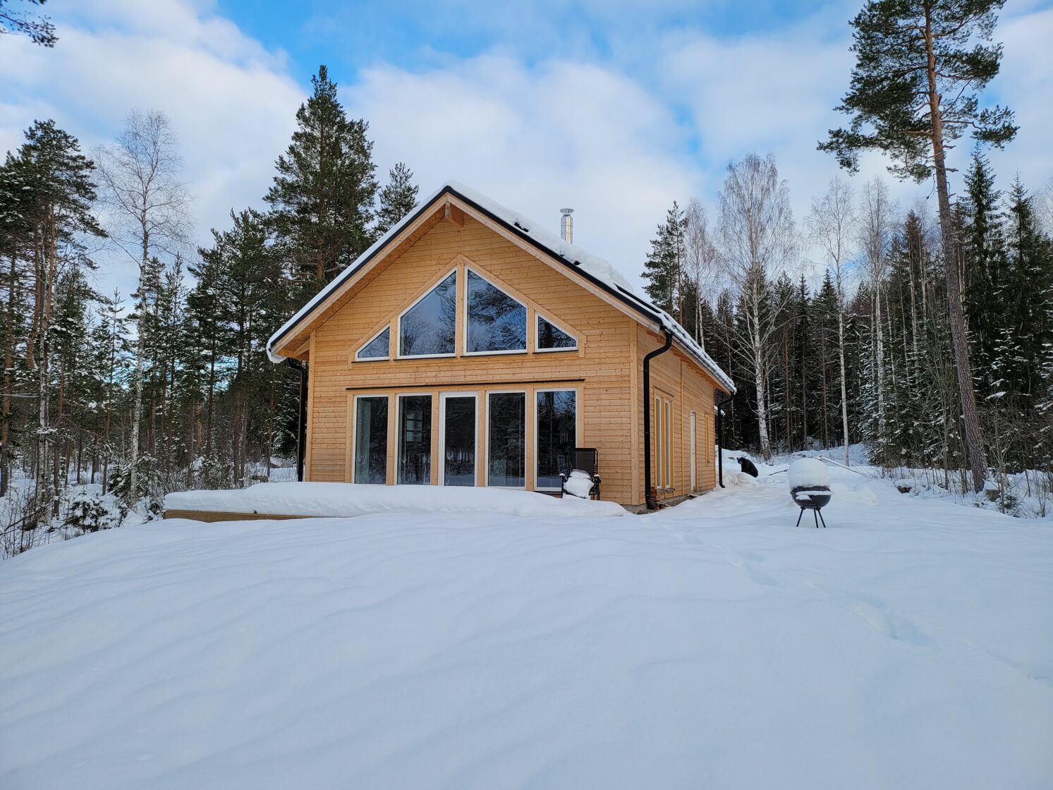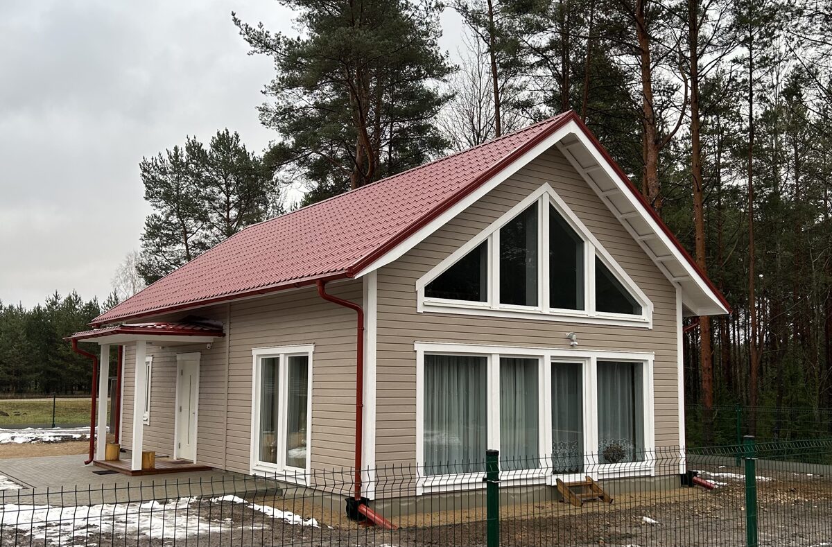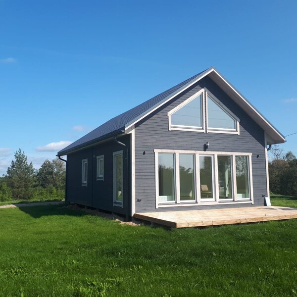 Mājas izgatavošana un montāža, metāla jumta segums, smalki zāģētu, krāsotu dēļu fasāde, 3 stiklu PVC logi un ārdurvis. No ārpuses pilnībā pabeigta, gatava iekšdarbiem. Ar iekļautu iekšdarbiem nepieciešamo 50mm siltumizolācijas, OSB un ģipškartonsa materiālu.